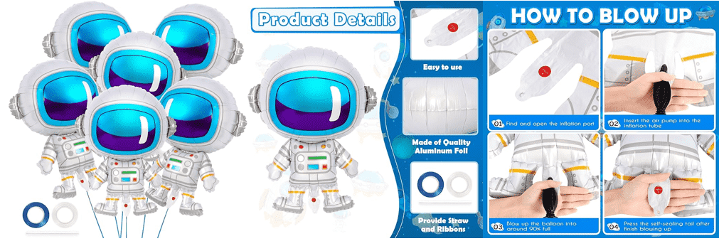 عام خلابازوں کو جسم کی مکمل شکل ہوتی ہے ، جس میں خلائی سوٹ پہنے ہوئے خلابازوں کی شبیہہ دکھائی جاتی ہے ، کچھ اسٹائل جس میں اڈے ہوتے ہیں ، انفلٹیبل کھڑا ہوسکتا ہے۔ یہاں مختلف سائز ہیں ، جیسے 18 انچ ، 24 انچ ، 28 انچ ، وغیرہ ، نیز کچھ بڑے غبارے ، جیسے 65 سینٹی میٹر کی اونچائی کے ساتھ کھڑے خلاباز ورق غبارے۔ یہ بنیادی طور پر خلائی تیمادار سالگرہ کی پارٹیوں ، بچوں کی بازگشت کرنے والی پارٹیوں ، بچوں کے کمرے کی سجاوٹ اور دیگر مواقع کے لئے استعمال ہوتا ہے ، جو اس واقعے میں خوشگوار خلائی ماحول کو شامل کرسکتے ہیں۔