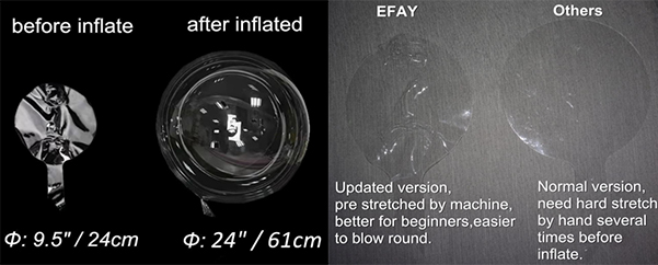 ان وسیع منہ والے بلبوں کے غبارے کو ہاتھ سے بڑھانے کے لئے کافی کوشش کی ضرورت ہے۔ نیون برانڈ خاص طور پر شپنگ سے پہلے مشین کے ذریعہ گببارے پھیلا دیتا ہے ، جب آپ کے وقت اور کوشش کی بچت ہوتی ہے۔ بہتر نتائج اور زیادہ گول غبارے کی شکل کے ل we ، ہم الیکٹرک ایئر پمپ کو استعمال کرنے کی تجویز کرتے ہیں۔