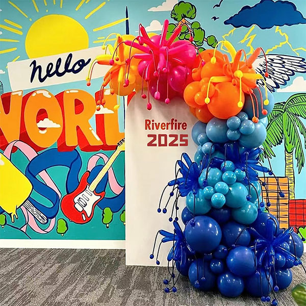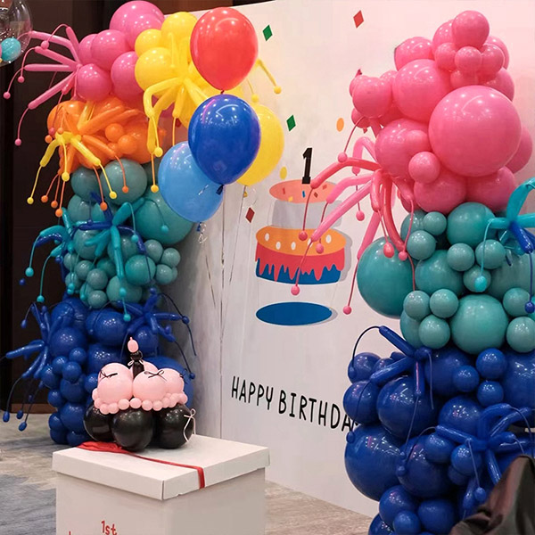گلابی اور نیلے رنگ کے مجموعے رنگین بیلون آرچ کٹس پارٹی کی سجاوٹ کے لیے مثالی ہیں۔