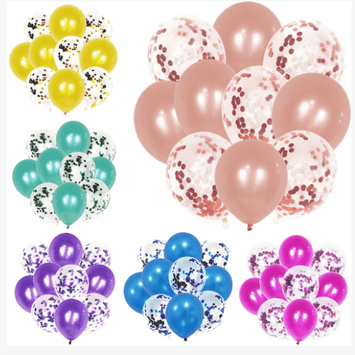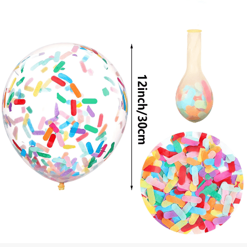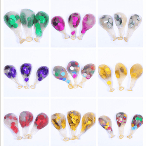 کنفیٹی غبارے عام طور پر 12 انچ کے شفاف لیٹیکس غبارے کا استعمال کرتے ہیں ہر غبارے میں 1 گرام کنفیٹیز ہوتے ہیں اور ہر پیکج میں 100 پی سیز ہوتے ہیں۔ اس سائز کے کنفیٹی غبارے کثرت سے استعمال ہوتے ہیں اور ان کے بہتر نتائج ہوتے ہیں، چاہے چھوٹے بیلون سوٹ ہوں یا غبارے کی چادر والی کٹس۔