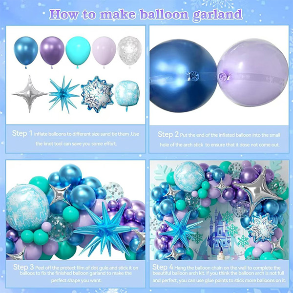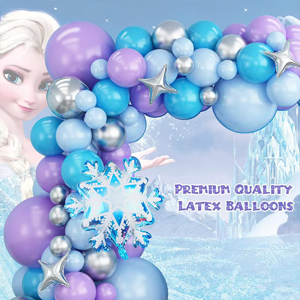 منجمد پارٹی کی سجاوٹ بیلون گارلینڈ کٹ مشہور منجمد IP سے متاثر ہوتی ہے۔ یہ فلم کے رنگوں کو درست طریقے سے دوبارہ پیش کرتا ہے۔ یہ نیلے ، چاندی ، جامنی اور سفید جیسے ٹھنڈے رنگوں کو جوڑتا ہے۔ نیلا اریینڈیل کے صبح سویرے آسمان کی طرح ہے۔ ہلکا جامنی رنگ کی طرح ہے جیسے جادوئی آئس کرسٹل کے ذریعہ پھٹے ہوئے چمک۔ چاندی کی سجاوٹ برف کے ٹکڑے کی عکاسی کی طرح ہوتی ہے۔ وہ بھرپور تہوں کے ساتھ رنگین نظام بناتے ہیں۔ وہ ایک غیر حقیقی اور خوبصورت بصری تجربہ تخلیق کرتے ہیں۔