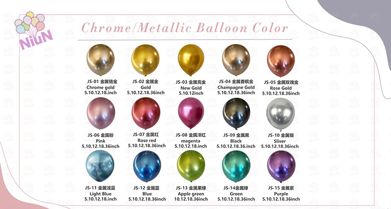 اعلیٰ معیار کے دھاتی رنگ کے غباروں کے چھوٹے سیٹوں میں گاڑھا، اعلیٰ لچکدار لیٹیکس استعمال ہوتا ہے۔ ان کی سطح آئینے جیسی چمکدار ہوتی ہے۔ روشنی ان سے منعکس ہوتی ہے۔ یہ ایک بھرپور، چمکدار دھاتی اثر پیدا کرتا ہے۔ باقاعدہ لیٹیکس غبارے فلیٹ اور دھندلا نظر آتے ہیں۔ یہ غبارے اونچے درجے کے محسوس ہوتے ہیں۔ وہ بھی فوراً آنکھ پکڑ لیتے ہیں۔