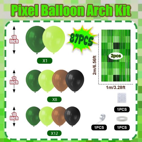 یہ مائن کرافٹ ویڈیو گیمز سے متاثر ہے، یہ پائیدار مائن کرافٹ بیلون آرچ کٹ سبز پکسل کے غباروں کے مختلف شیڈز کو مائن کرافٹ تھیم والے پارٹی بیک ڈراپس کے ساتھ جوڑ کر ایک چنچل تہوں والی شکل تخلیق کرتی ہے جو کلاسک ایڈونچر گیمز کی دلکشی کو اپنی لپیٹ میں لے لیتی ہے۔