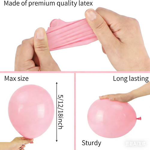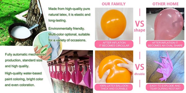 غبارے کا خام مال: جنوب مشرقی ایشیا سے درآمد شدہ خالص قدرتی لیٹیکس سے بنایا گیا ہے۔ غبارے زیادہ لچکدار ہوتے ہیں، بڑے سائز میں اڑائے جا سکتے ہیں، ان کے پھٹنے کا امکان کم ہوتا ہے، اور ماحول کو آلودگی کا باعث بنے بغیر مکمل طور پر قدرتی طور پر انحطاط پذیر ہو سکتا ہے۔