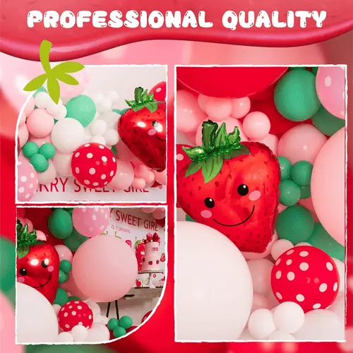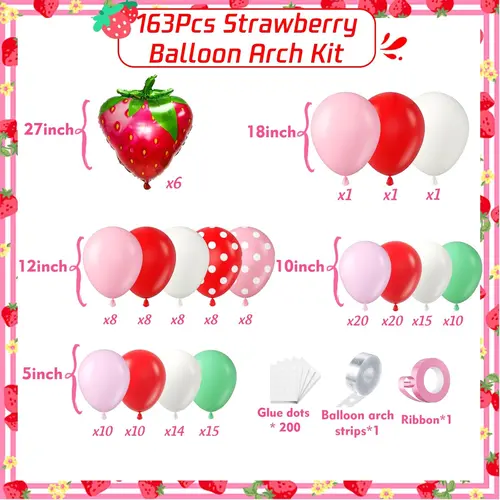 اسٹرابیری تھیم والے غبارے کی مالا اعلیٰ معیار کے لیٹیکس غبارے اور فوائل غبارے پر مشتمل ہے۔ کٹ میں سب سے نمایاں آئٹم 27 انچ کا اسٹرابیری فوائل بیلون ہے۔ اس کے علاوہ اس میں موجود لیٹیکس کے غبارے بھی ایک اہم حصہ ہیں۔ کٹ میں موجود لیٹیکس کے غبارے مختلف رنگوں اور سائز کے ہیں، جو خوبصورت تہیں بنا سکتے ہیں۔ لیٹیکس غبارے کا رنگ میکارون گلابی، دھندلا سرخ، دھندلا گہرا گلابی، ریٹرو ہاتھی دانت سفید ہے۔