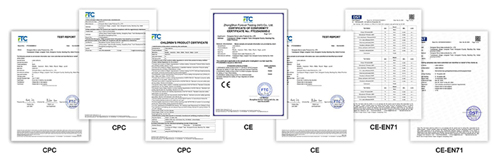 ہماری مصنوعات کی پوری رینج یورپی اور امریکن اور دیگر ٹارگٹ مارکیٹ سیفٹی ریگولیشنز کی سختی سے تعمیل کرتے ہوئے CPC، CE، EN71 اور دیگر مستند سرٹیفیکیشن کو پاس کر چکی ہے۔ یہ قابلیت آپ کے سامان کو کسٹم کو آسانی سے صاف کرنے اور بیرون ملک منڈیوں میں تعمیل کے خطرات سے مکمل طور پر بچنے میں مدد دے سکتی ہے۔