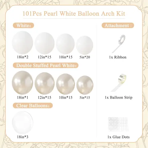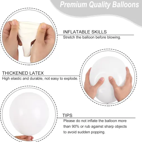 ہر سفید شادی کے غبارے کے محراب میں غبارے کے نقطے، غبارے کی پٹی، ربن، غبارے کے تعلقات ہیں۔ ایک خوبصورت اور مربوط شادی کی سجاوٹ کا اثر پیدا کرنے کے لیے سبھی کو احتیاط سے ملایا گیا ہے۔